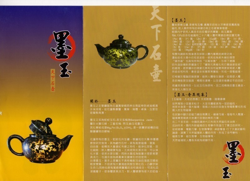 花蓮特有的墨玉,蛇紋石共生礦,根據(成功大學-林憲德教授 研究)為超鹹性石材,具有高度磁場,氫氣自由基,能釋放大量(遠紅外線)之特性,能淨化空氣,活化細胞,對人體健康有益,尤其使用於茶水中,可以淨化水質,使茶水更甘醇,同時水質成為能量水使飲者更具活力。